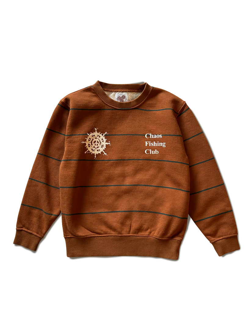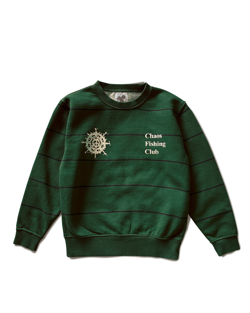 糸から選び編み立てたオリジナル配色のボー ダースウェット。Chaos Fishing Club とのコ ラボレーションです。One Wash をかけることでユーズド感をプラスしました。